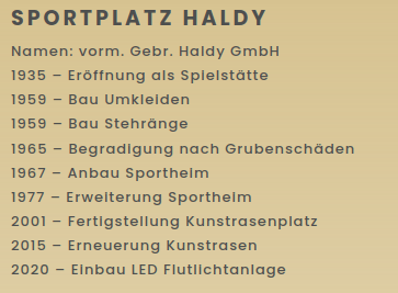 Fast zwanzig Jahre später, 1963, machten Bergschäden das Kicken schwer, zum Teil ruhte sogar der Spielbetrieb. Mehrere Sanierungen des Hartplatzes und die ersten beiden Kunstrasenplätze 2001 und 2015 folgten. Diese gewaltigen Bauvorhaben stemmte der SV Preußen – mit diesem Namen einmalig im Saarland- nur mit vielen freiwilligen Helfern. Heute kümmert sich ein rühriges Bauteam unter der Leitung von Jörg Schaum um das Stadion und seine gesamte Infrastruktur. Der Haldy hat sich zu einem echten Schmuckstück der Gemeinde entwickelt.