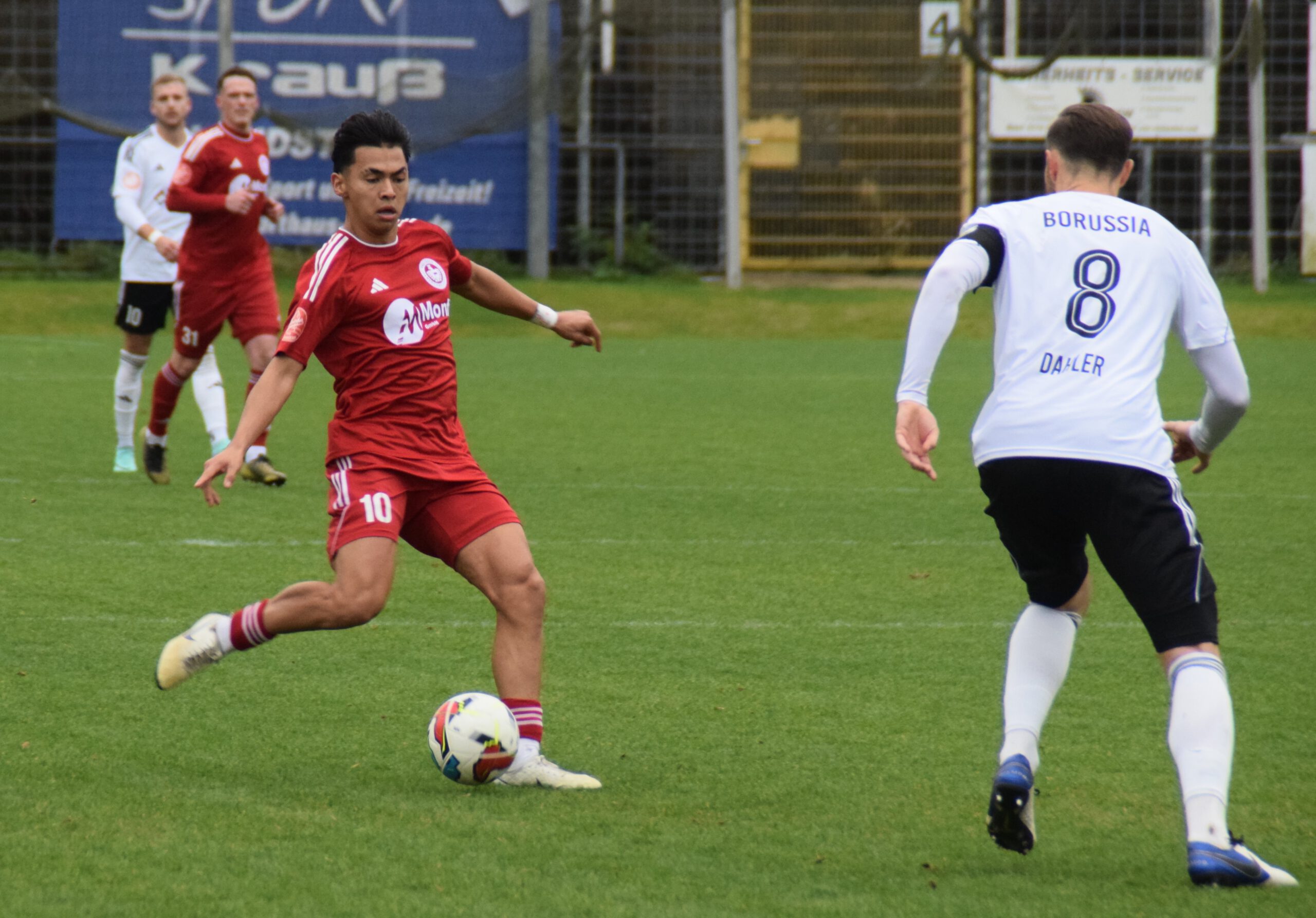 Unser Coach bringt in der zweiten Hälfte Bamberg für Hornung, das Spiel ist nun offensiver (47.). Die Borussia bedient Schreibeisen mit einem langen Ball, Torben läuft raus, schießt Schreibeisen an, von ihm prallt das Leder ins Netz. Aber kein Tor, Handspiel (50.). Wieder Schreibeisen, Flachschuss, knapp vorbei (54.). David Lesch umkurvt Max auf der rechten Seite, aber Winkel zu spitz, Außennetz (57.). Ecke Perez, Kopfball Simon Jostock, Max boxt das Leder von der Linie. (63.). Wir sind nah dran am Ausgleich. Wieder Perez, starke Direktannahme wie zuletzt auf dem Haldy, Max wehrt zur Ecke ab (70.). Pirron für Affes und Schwindling für Lesch versprechen noch mehr Druck (73.), ebenso Sampson für Wolter (84.). Alarm vor dem Borussen-Strafraum, aber bis auf zwei weitere Schussversuche aus spitzem Winkel (Pirron/80. und Schwindling/90.) gelingt uns leider nichts mehr. Dass Hoffmann unseren Trainer nach dem Abpfiff mit einem Grinsen im Gesicht noch beleidigen muss, ist grob unsportlich. Da kann man nur den Kopf schütteln. Auch zum Verhalten eines älteren Borussen-„Fans“, der Schiri Schyma fast eine Viertelstunde lang lauthals aufs Übelste beschimpfte. Was geht nur in diesen Köpfen vor?