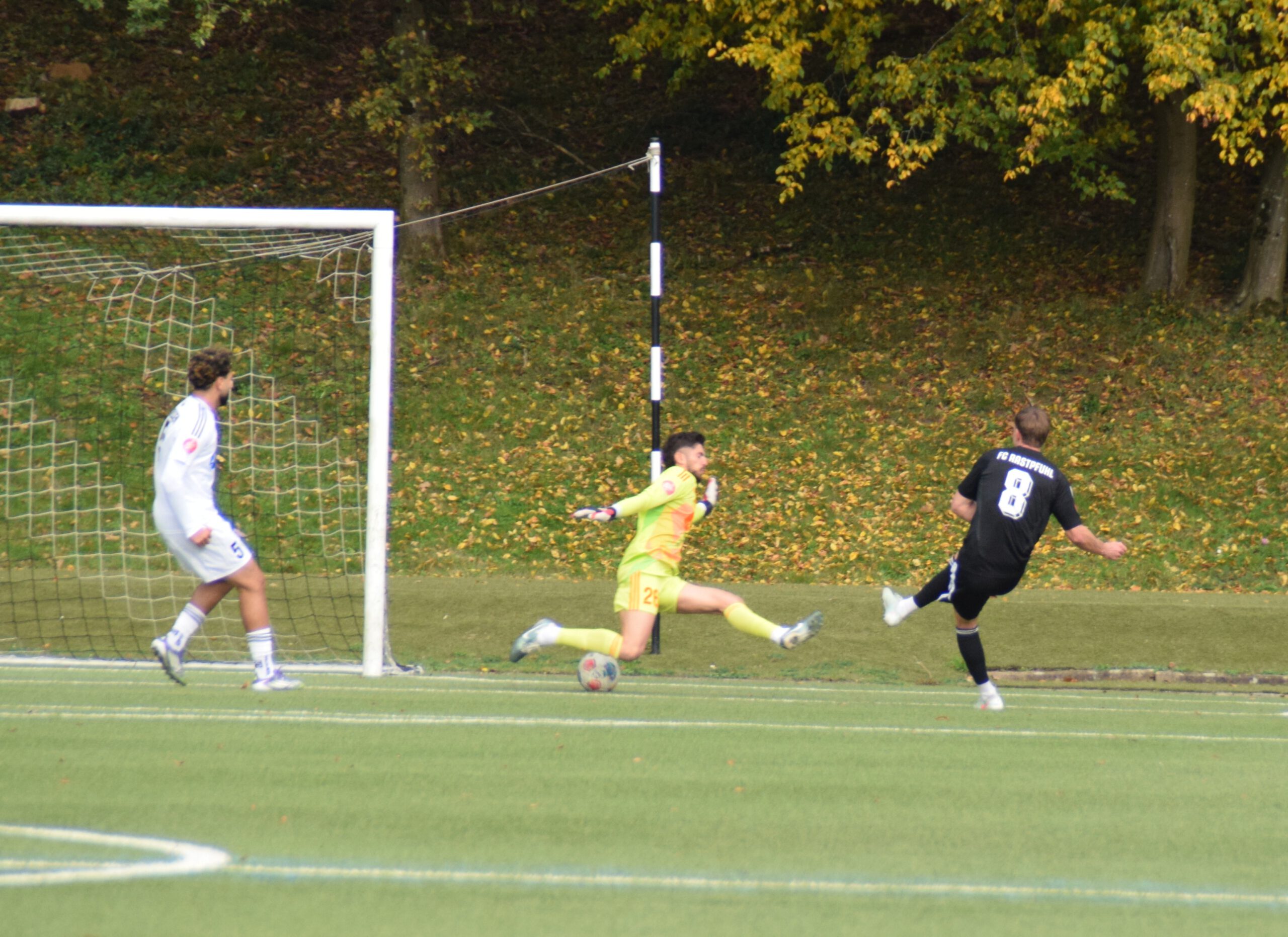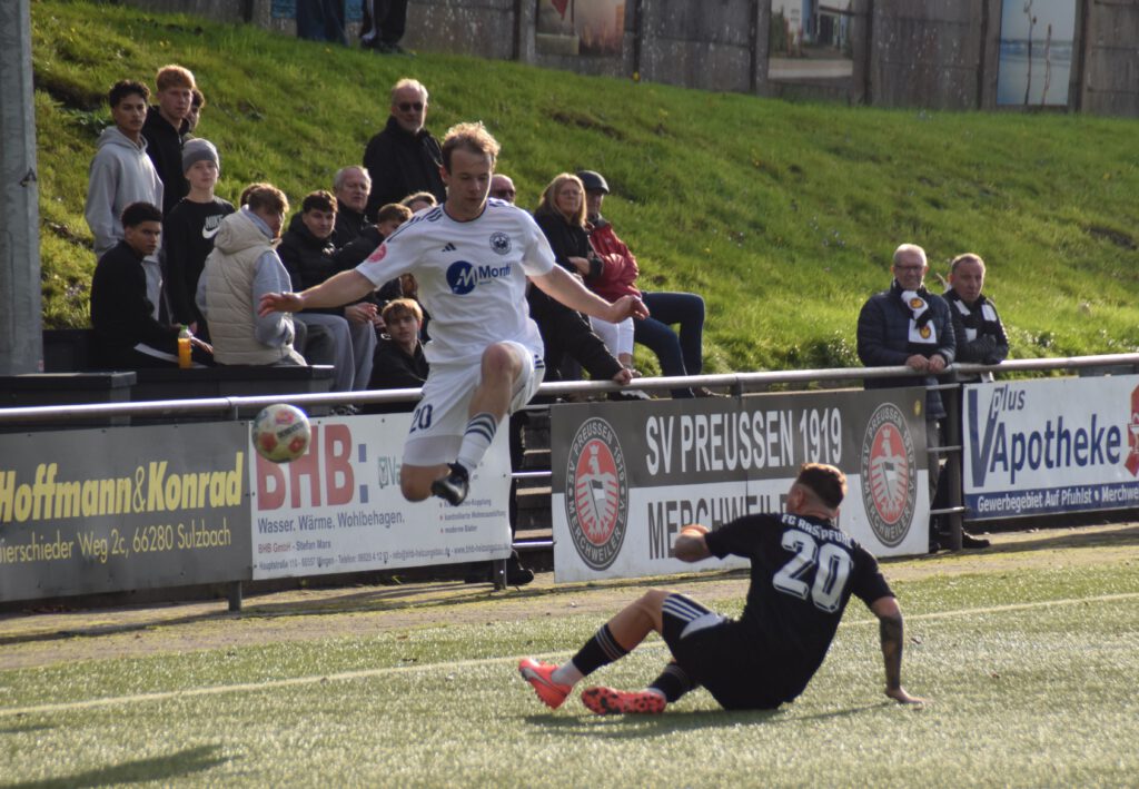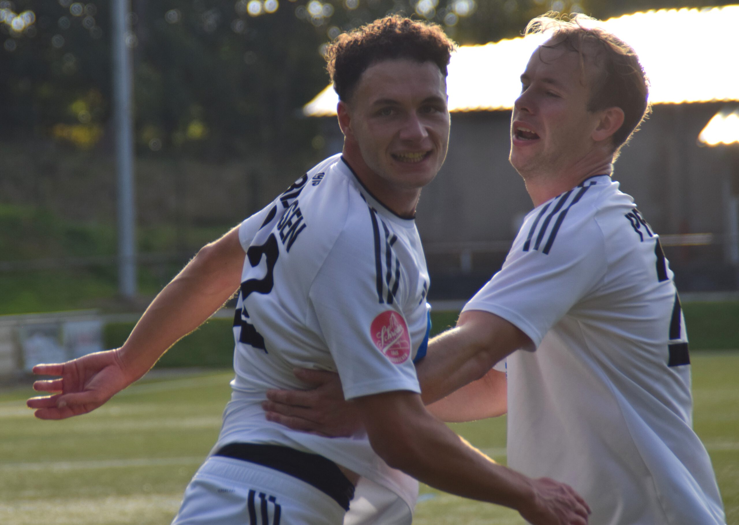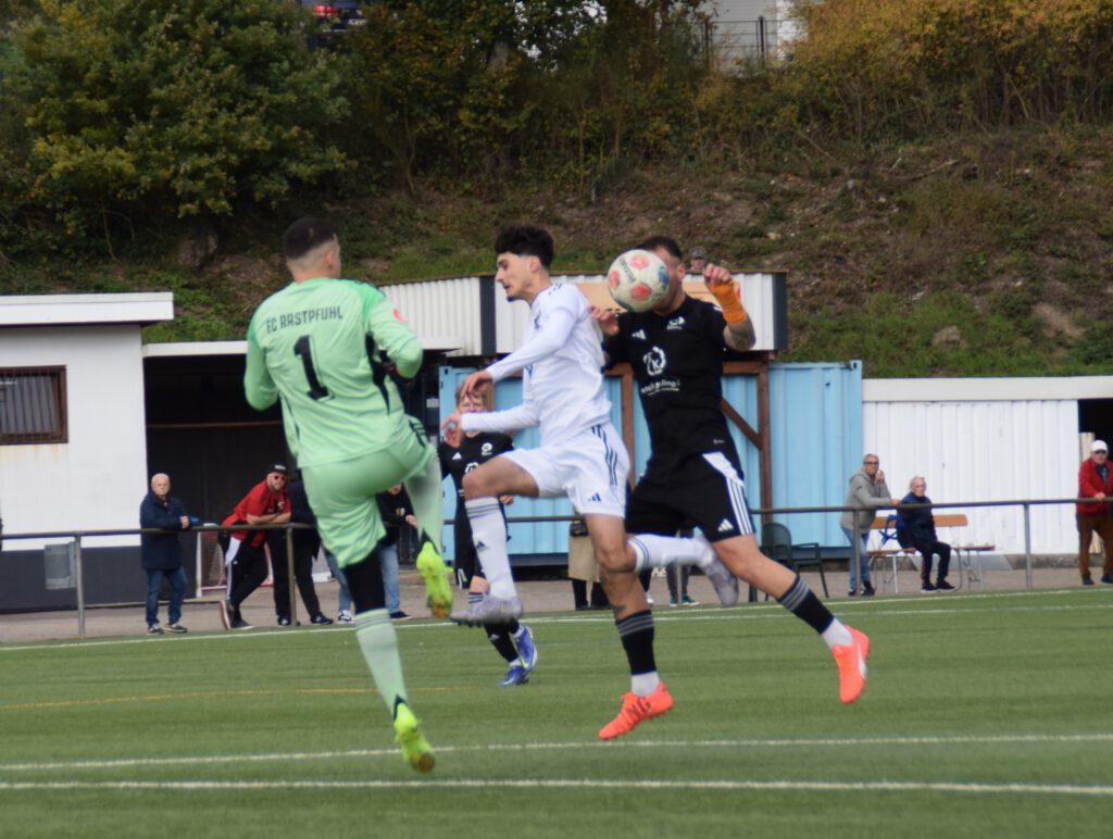 Wie erwartet ging es sehr engagiert zur Sache. Rastpfuhl, mit Trainer Sebastian Kleer und Spieler Matthias Denne, ehemaligen „Merchweller Buwe“, verstärkt, machte uns offensiv schwer zu schaffen. Frühe Führung durch Recktenwald, der nach Konter flach gegen Art Zenunaj einschiebt (9.). Im Gegenzug der Ausgleich. Yehudi Elmas geht zum Kopfball hoch mit Denne, der lässt mit Eigentor seinem Schlussmann keine Chance: 1:1 (10.).